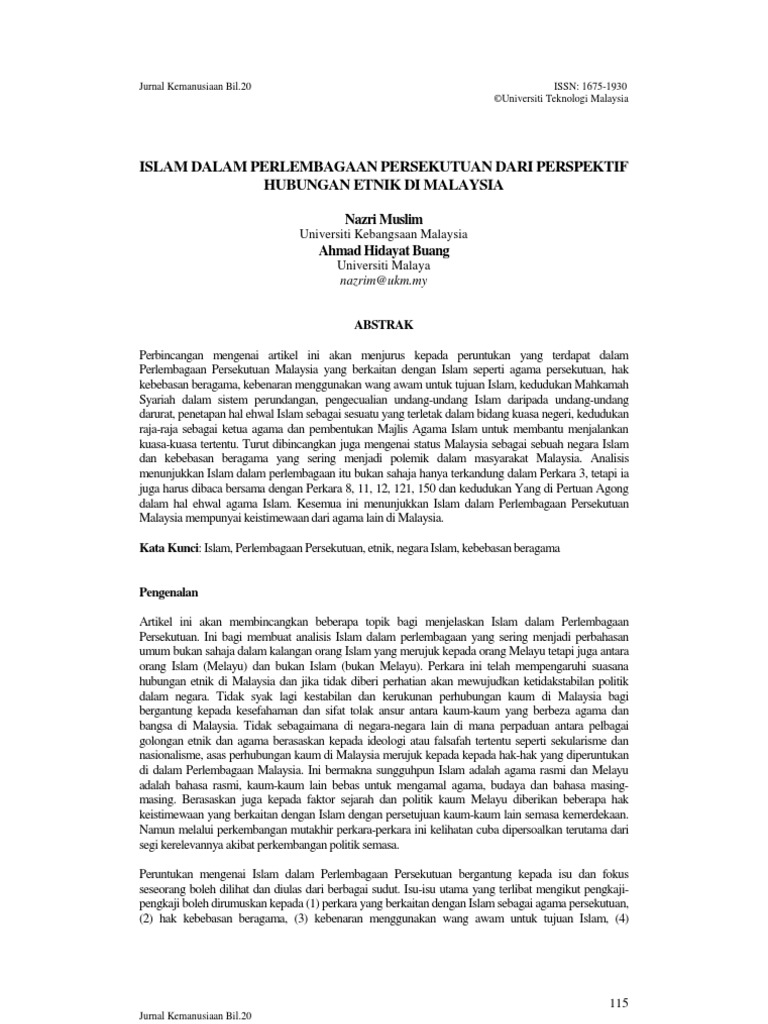 Malangnya, sekalipun peruntukan tersebut sudah jelas dikanunkan, namun masih mendapat pentafsiran berbeza sehingga memberi implikasi yang berlainan daripada tujuan sebenar pemaktubannya. Merupakan dokumen sumber segala perundangan lain yang wujud dalam negara 4. 18 abdul aziz bari, islam dalam perlembagaan malaysia, intel multimedia and publication, petaling jaya, 2005 cetakan 1 19 perkara 3(1) perlembagaan persekutuan 20 perkara 11 perlembagaan persekutuan 21 perkara 12(2) perlembagaan persekutuan 22 perkara 121 (1a) perlembagaan persekutuan 23 perkara 150 (6a) perlembagaan persekutuan 8 Islam adalah agama rasmi malaysia. Pelucutan kewarganegaraan orang yang menjadi warganegara pada hari malaysia. Bahasa kebangsaan telah diputuskan dalam perlembagaan persekutuan iaitu bahasa melayu sebagai bahasa kebangsaan. Dalam perlembagaan persekutuan pada perkara 3(1) menyatakan bahawa agama islam merupakan agama rasmi persekutuan. Kedaulatan atau hak kedaulatan yang ditetapkan atau diperlindung oleh peruntukan bahagian 3 perkara 152 153 dan 181 berhubung dengan apa apa jua melainkan berhubung dengan pelaksanaannya sebagaimana yang dinyatakan dalam undang undang itu. Perlembagaan persekutuan malaysia berasaskan kepada perlembagaan tanah melayu 1957. Perkara 152 adalah berkaitan dengan bahasa kebangsaan. 2 3.6 maruwiah ahmat 1 ctu553/555 acis, uitm pendahuluan perkara yang menyentuh isu bahasa, agama, bumiputera dan kewarganegaraan dalam hubungan etnik perlembagaan malaysia menjadi faktor penting untuk mewujudkan hubungan etnik yang erat dan utuh di kalangan rakyat malaysia. Kebebasan bercakap, berh perkara 11. Perjalanan kuat kuasa peruntukan peralihan dalam akta malaysia.